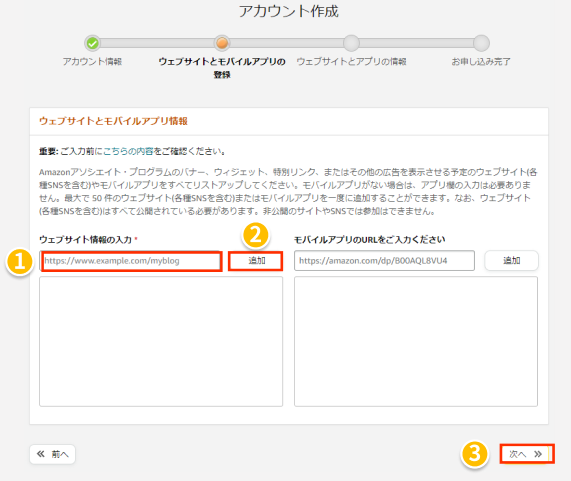 ウェブサイト情報(自身のブログやTwitterなどのURL)を入力し、「追加」ボタンを押下後、「次へ」をクリックする。
