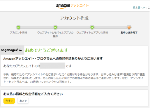 上記画面が表示されたらAmazonアソシエイトへの申請完了です。
