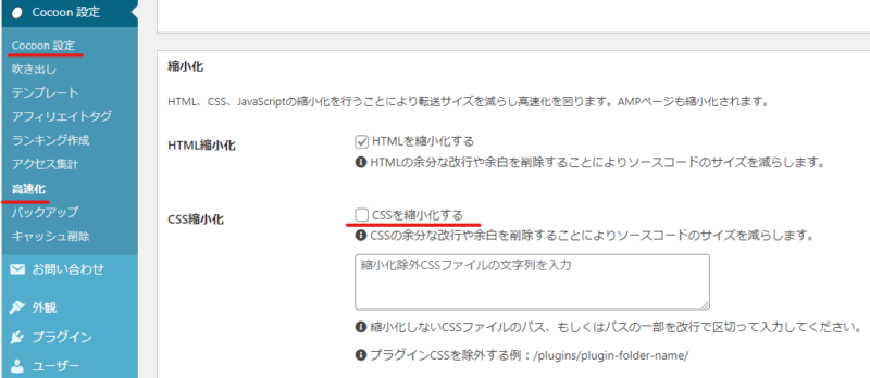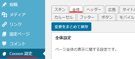 ダッシュボードを開き「Cocoon設定」→「全体」と選び、